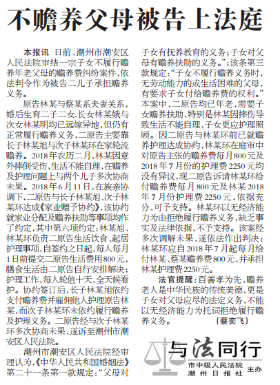 日前,潮州市潮安区人民法院审结一宗子女不履行赡养年老父母的赡养费纠纷案件,依法判令作为被告二儿子承担赡养义务。