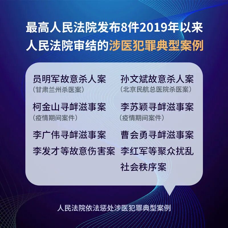 这些案例从多个角度阐述了人民法院对涉医犯罪“零容忍”的态度和立场,体现了人民法院服务保障医疗卫生事业健康发展、服务保障民生的责任和使命。