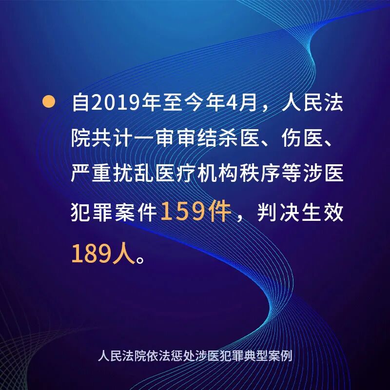 在审判工作中,人民法院始终充分发挥刑事审判职能,坚持对涉医犯罪依法从严惩处、及时审判。自2019年至今年4月,人民法院共计一审审结杀医、伤医、严重扰乱医疗机构秩序等涉医犯罪案件159件,判决生效189人。