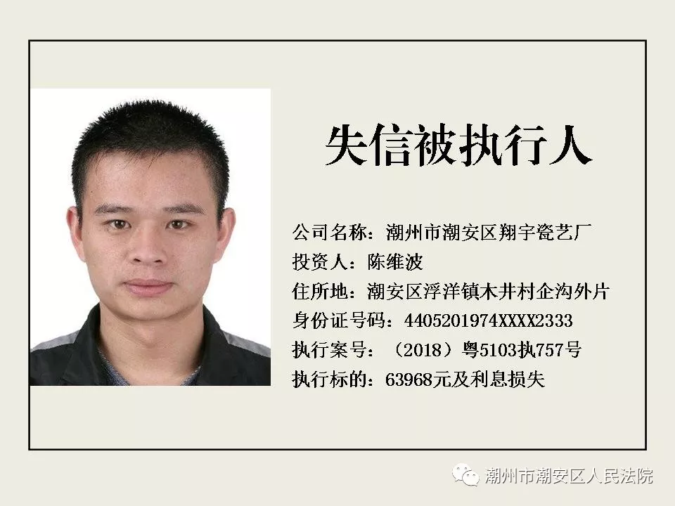 潮州市潮安区人民法院发布第八批失信被执行人公告