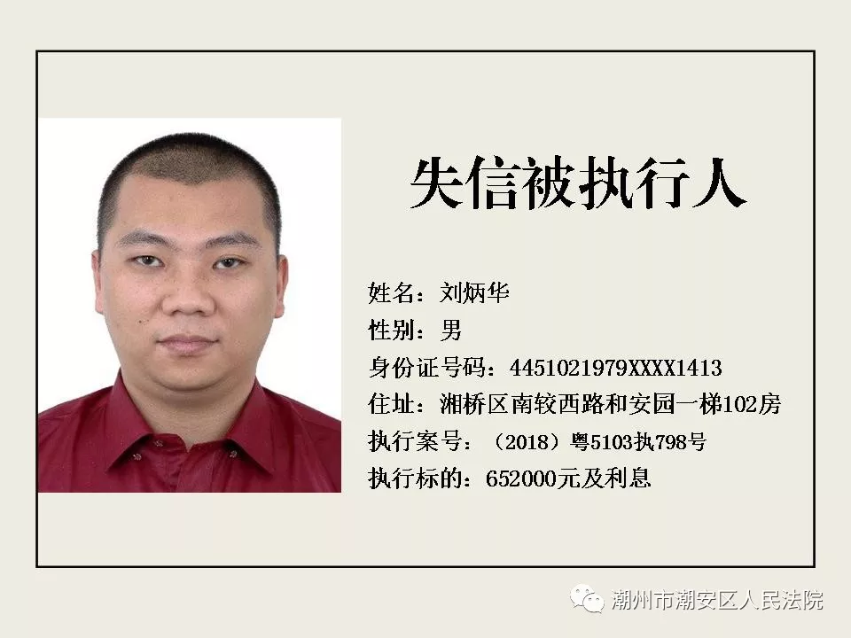 为进一步化解执行难,加大对失信被执行人的信用惩戒力度,维护司法公正、公开与当事人的合法权益,促使被执行人自觉履行生效法律文书确定的义务。根据《中华人民共和国民事诉讼法》第二百五十五条、《最高人民法院关于公布失信被执行人名单信息的若干规定》的规定第一条、第五条、《最高人民法院关于适用中华人民共和国民事诉讼法的解释》第五百一十八条以及《最高人民法院关于限制执行人高消费及有关消费的若干规定》第一条、第六条、第七条的规定,潮安区人民法院决定将下列被执行人纳入全国失信被执行人名单(第九批)并采取限制消费措施,特此公告。