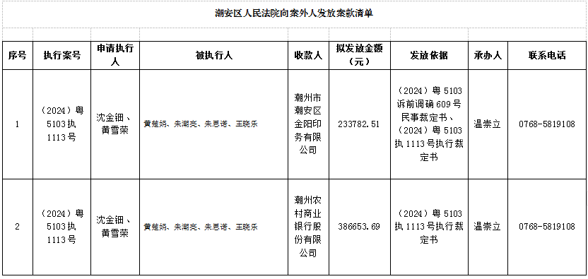 为进一步规范执行案款收发、管理,保护债权人权益,落实人民法院向案外人发放案款公示制度要求,现将本院拟向案外人发放案款案件公示如下(公示期限:三个工作日):
